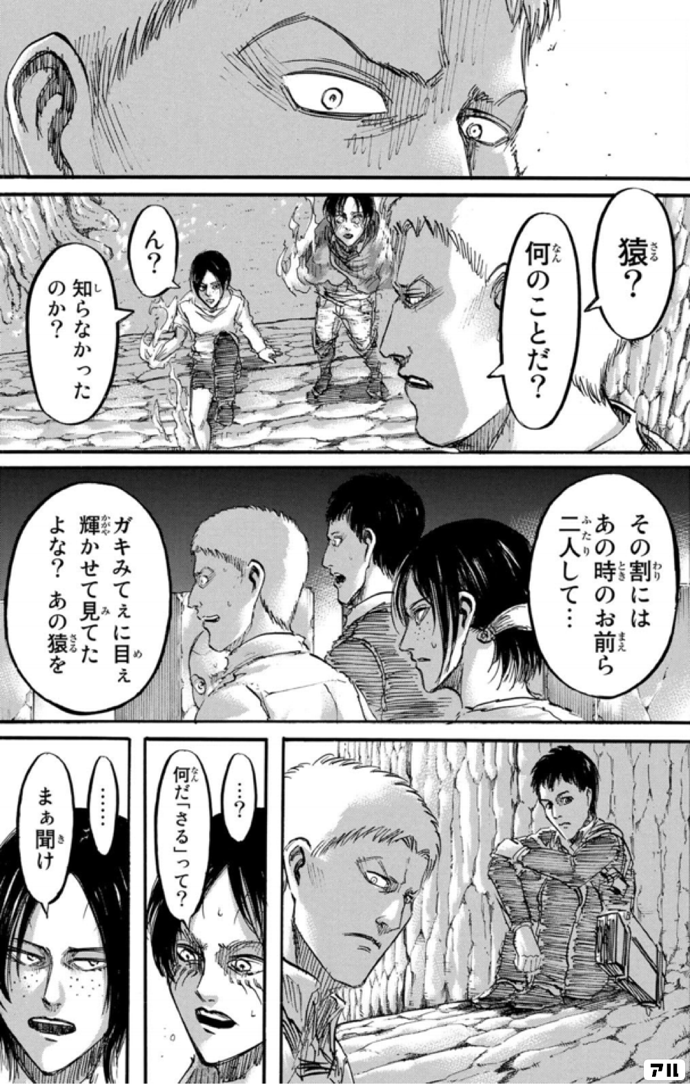 猿 何のことだ ん 知らなかったのか その割には あの時のお前ら二人して ガキみてぇに目ぇ輝かせてみてたよな あの猿を 何だ さる って まぁ聞け 進撃の巨人 アル